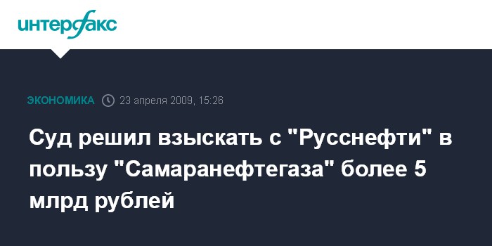 Москва. 23 апреля. INTERFAX.RU - Московский арбитражный суд в четверг удовлетворил иск ОАО "Самаранефтегаз" и решил взыскать с "Русснефти" (РТС: RUSN) более 5 млрд рублей.