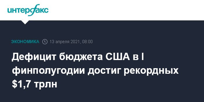 Москва. 13 апреля. INTERFAX.RU - Дефицит госбюджета США в первом полугодии 2021 финансового года достиг рекордных $1,7 трлн, увеличившись за год на 130%, свидетельствуют данные министерства финансов страны.