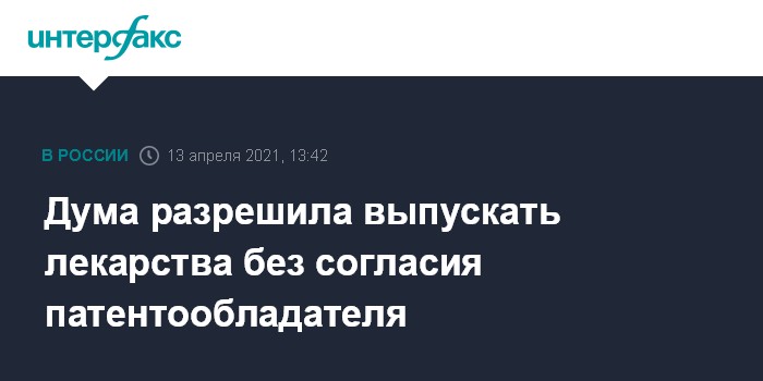 Москва. 13 апреля. INTERFAX.RU - Госдума приняла в третьем чтении законопроект № 842633-7 о чрезвычайном полномочии правительства использовать зарубежный патент или изобретение, если это нужно для защиты здоровья граждан.