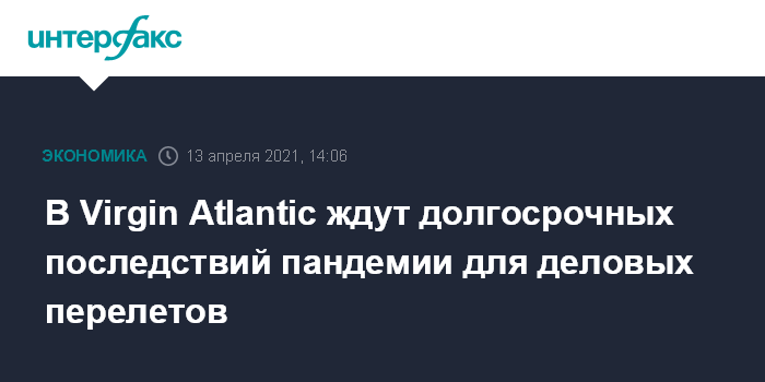 Москва. 13 апреля. INTERFAX.RU - Британская Virgin Atlantic Airways ожидает, что количество деловых поездок в ближайшие два года будет на 20% ниже доковидного уровня, сказал Financial Times гендиректор авиакомпании Шай Вайс.
