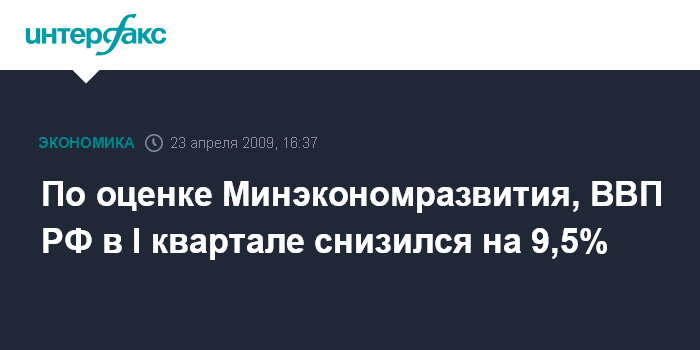 Москва. 23 апреля. INTERFAX.RU - ВВП РФ, по оценке Минэкономразвития, в первом квартале 2009 года снизился на 9,5% по сравнению с первым кварталом 2008 года, сообщил замминистра экономического развития Андрей Клепач на брифинге в четверг.