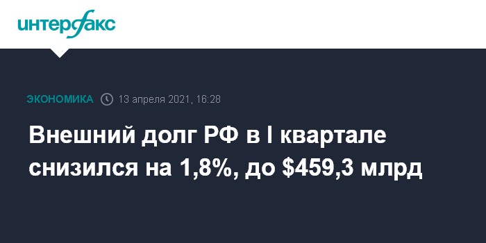 Москва. 13 апреля. INTERFAX.RU - Внешний долг РФ в первом квартале 2021 года снизился на $8,553 млрд, или на 1,8%, до $459,306 млрд, сообщается в информации, размещенной на сайте ЦБ РФ.