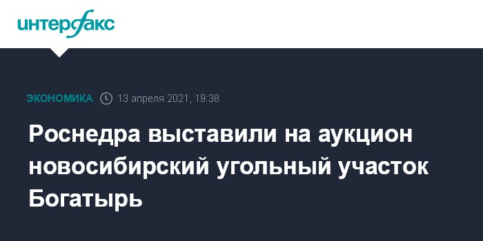 Москва. 13 апреля. INTERFAX.RU - Роснедра 11 июня проведут аукцион по угольному участку Богатырь Горловского месторождения в Новосибирской области. Стартовый размер платежа составляет 1,502 млрд рублей, заявки на участие принимаются до 13 мая, говорится в сообщении Роснедр.