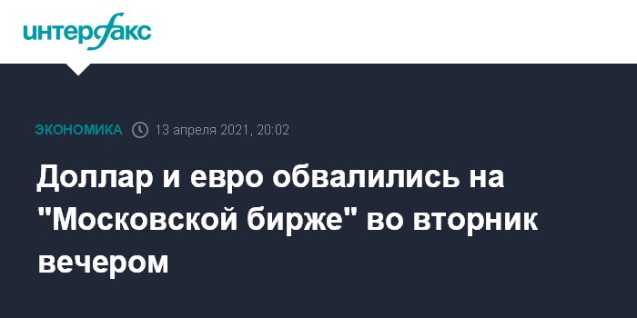 Москва. 13 апреля. INTERFAX.RU - Доллар и евро обвалились на "Московской бирже" во вторник вечером, рубль уверенно вырос к бивалютной корзине благодаря снижению геополитической напряженности вокруг РФ на сообщениях о телефонном разговоре между президентами России и США, и предложении американского лидера провести саммит, чтобы обсудить весь спектр актуальных проблем.