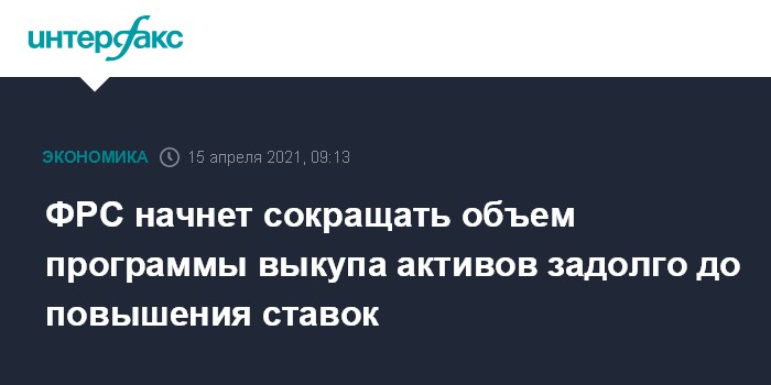 Москва. 15 апреля. INTERFAX.RU - Федеральная резервная система СШ начнет сокращать объем программы выкупа активов задолго до того, как приступит к повышению процентных ставок, заявил глава Центробанка Джером Пауэлл.