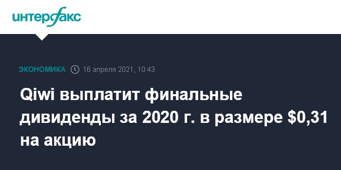 Москва. 16 апреля. INTERFAX.RU - Совет директоров Qiwi принял решение выплатить финальные дивиденды за 2020 год в размере $0,31 на акцию, говорится в сообщении компании.