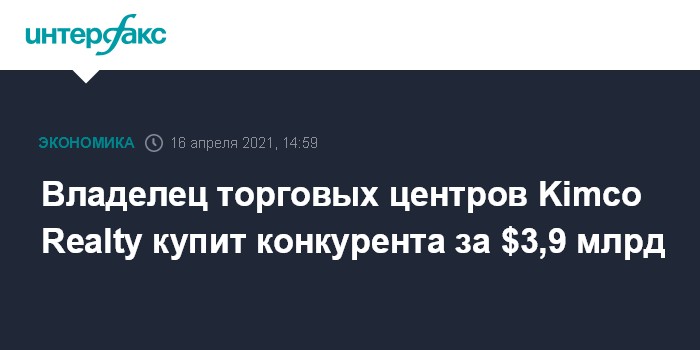 Москва. 16 апреля. INTERFAX.RU - Инвестиционный траст недвижимости Kimco Realty Corp., один из крупнейших в Северной Америке владельцев торговых центров под открытым небом, договорился о приобретении конкурирующего фонда Weingarten Realty Investors примерно за $3,9 млрд.