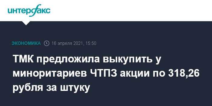 Москва. 16 апреля. INTERFAX.RU - ПАО "Трубная металлургическая компания" сообщило, что направило миноритарным акционерам ПАО "Челябинский трубопрокатный завод" обязательное предложение о приобретении ценных бумаг по цене 318,26 рубля за акцию. 1 апреля ТМК сообщала, что днем ранее направила эту оферту в Банк России.