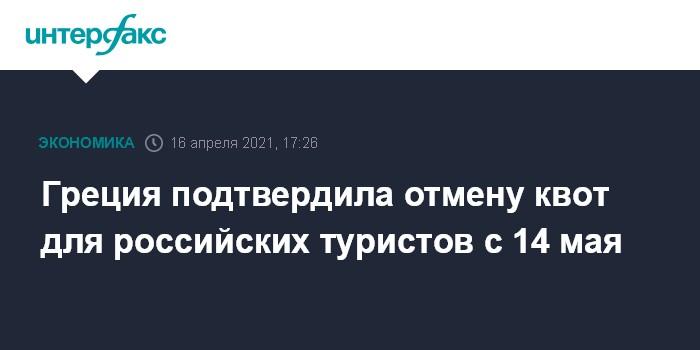 Москва. 16 апреля. ИНТЕРФАКС - Греция с 14 мая отменит квоты для российских туристов и будет пускать их с ПЦР-тестом или сертификатом о вакцинации без требования выдерживать карантин по приезде, сообщил министр туризма республики Харис Теохарис. О планах отменить квоты для туристов из некоторых стран, в том числе из России, стало известно в середине марта.