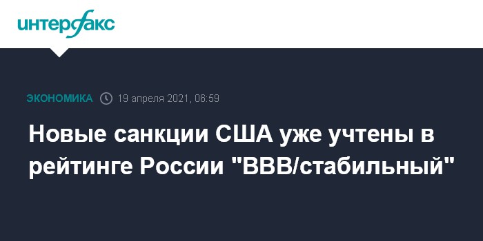 Москва. 19 апреля. INTERFAX.RU - Рейтинг Российской Федерации "BBB/стабильный" устойчив к новым американским санкциям, говорится в комментарии международного рейтингового агентства Fitch.