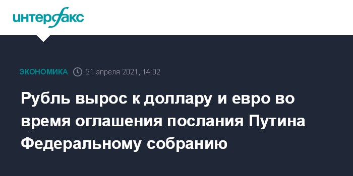 Москва. 21 апреля. INTERFAX.RU - Доллар и евро заметно снизились во время оглашения международной части послания Федеральному собранию президента России Владимира Путина после того, как он обратился с предложением западным партнерам обсудить тему стратегического вооружения, а также не упомянул в речи тему конфликта в Донбассе и нынешние взаимоотношения РФ с Украиной.