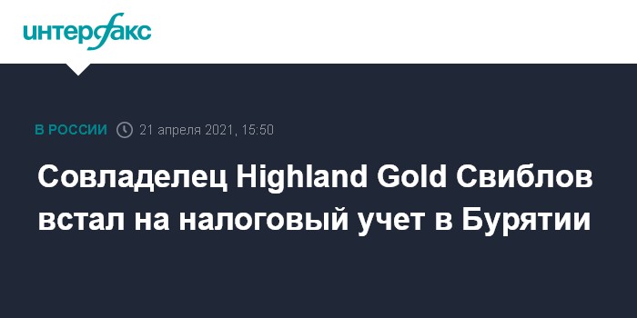 Москва. 21 апреля. INTERFAX.RU - Совладелец Highland Gold Владислав Свиблов встал на налоговый учет в Бурятии, где занимается освоением Озерного месторождения полиметаллов, сообщил "Интерфаксу" представитель бизнесмена.