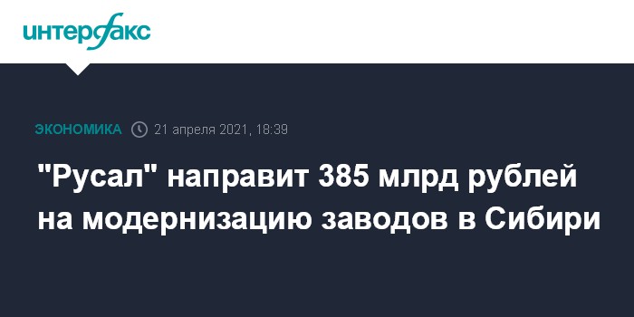 "Русал" направит 385 млрд рублей на модернизацию заводов в Сибири
