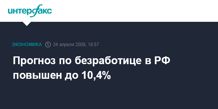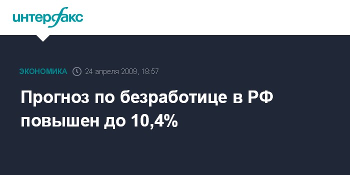 Москва. 24 апреля. INTERFAX.RU - Минэкономразвития существенно повысило прогноз по уровню безработицы в среднем в 2009 г. до 10,4-10,7% с 8,2%, сообщил "Интерфаксу" источник, знакомый с последним рабочим прогнозом министерства социально-экономического развития на 2009-2012 годы.