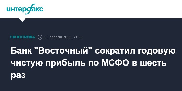 Москва. 27 апреля. INTERFAX.RU - Банк "Восточный" в 2020 году сократил чистую прибыль по МСФО в 6 раз - до 1,0 млрд рублей по сравнению с 6,2 млрд рублей прибыли в 2019 году, говорится в его отчете.