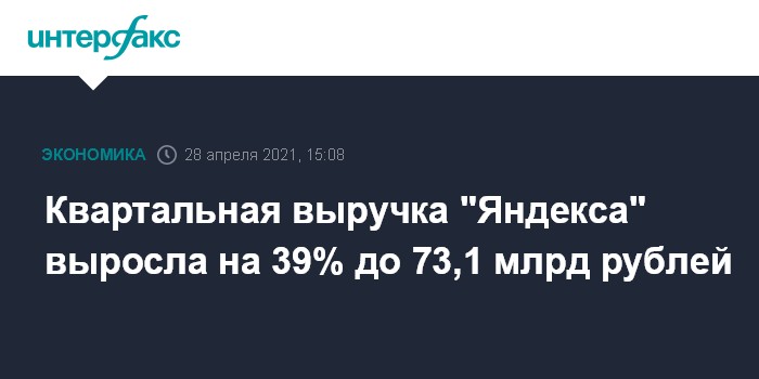 Москва. 28 апреля. INTERFAX.RU - В I квартале 2021 года консолидированная выручка "Яндекса" по US GAAP выросла на 39% в годовом измерении и составила 73,1 млрд рублей, говорится в отчете компании. Показатель учитывает финансовые результаты "Яндекс.Маркета", 100% которого было консолидировано в июле прошлого года.
