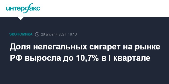 Москва. 28 апреля. INTERFAX.RU - Доля нелегальных сигарет на российском табачном рынке в I квартале 2021 года составила 10,7%, свидетельствуют результаты аналитического исследования Kantar TNS.