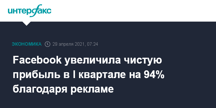 Москва. 29 апреля. INTERFAX.RU - Американская Facebook Inc., которой принадлежит крупнейшая в мире социальная сеть, увеличила чистую прибыль в первом квартале 2021 года на 94%, выручку - на 48%, благодаря существенному росту доходов от рекламы.