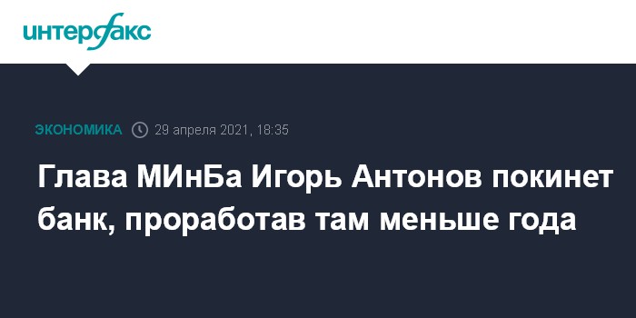 Последним рабочим днем Антонова на посту председателя правления МИнБа станет 30 апреля. Временное исполнение обязанностей председателя правления с 1 мая возложено на Владимира Яшина, занимающего пост зампреда МИнБа.