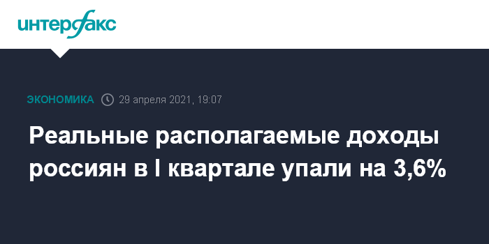 Москва. 29 апреля. INTERFAX.RU - Падение реальных располагаемых доходов населения РФ в I квартале 2021 года составило 3,6% в годовом сравнении, говорится в основном докладе Росстата за I квартал.