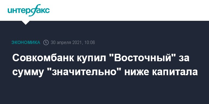 Москва. 30 апреля. INTERFAX.RU - Совкомбанк купил банк "Восточный" за сумму "значительно" ниже его капитала (на 1 марта 2021 года - 27 млрд рублей), сообщил в интервью РБК совладелец и первый заместитель председателя правления Совкомбанка Сергей Хотимский.