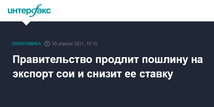 8 апреля о том, что экспортную пошлину на сою с июля могут понизить до 20%, но не менее $100 за тонну, "Интерфаксу" сообщил источник, знакомый с обсуждением этого вопроса.
