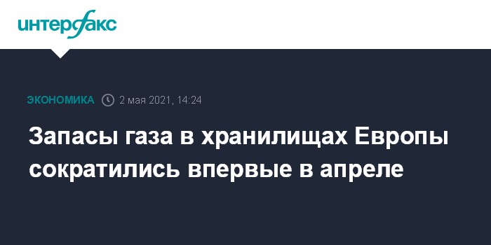 Москва. 2 мая. INTERFAX.RU - Запасы газа в подземных хранилищах Европы за апрель 2021 года не выросли, а сократились - впервые за историю наблюдений публичной базы Gas Infrastructure Europe (c 2011 года). На 31 марта уровень запасов был 30,06%, а на 30 апреля - 29,91%.