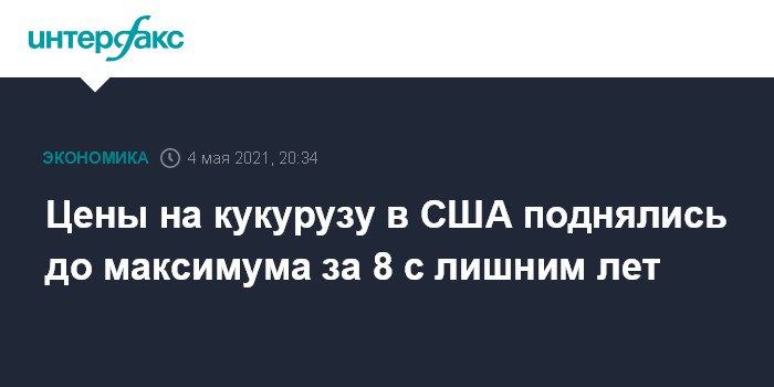 Москва. 4 мая. INTERFAX.RU - Цены на кукурузу в США поднялись до максимума более чем за 8 лет - с марта 2013 года, сообщает агентство Bloomberg.