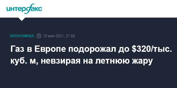 Москва. 10 мая. INTERFAX.RU - Спотовая цена газа в Европе с началом новой рабочей недели продолжила рост, не обращая внимание на пришедшую в регион почти что летнюю тридцатиградусную жару.