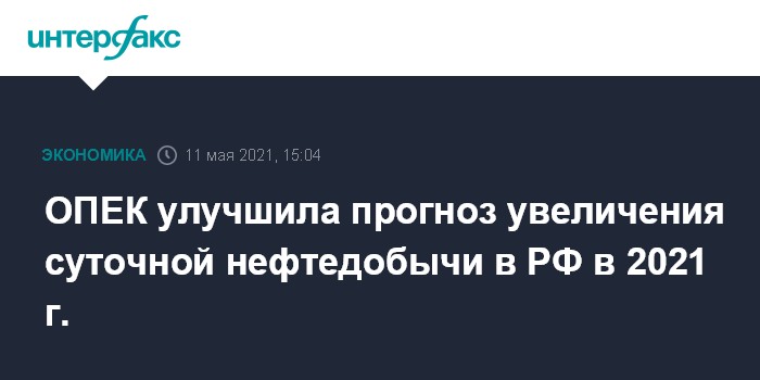 Москва. 11 мая. INTERFAX.RU - ОПЕК в своем новом прогнозе предсказывает рост производства нефти в 2021 году в России на 20 тыс. б/с – до 10,61 млн б/с. Об этом говорится в ежемесячном отчете организации. Ранее ожидалось увеличение производства в 2021 году на 10 тыс. б/с – до 10,6 млн б/с.