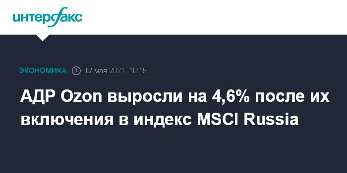 Москва. 12 мая. INTERFAX.RU - Американские депозитарные расписки (АДР) маркетплейса Ozon на старте торгов Московской биржи в среду выросли в цене на 4,6% (до 4340 рублей за штуку) после того, как индексный провайдер MSCI включил их в свои индексы по итогам полугодового пересмотра.