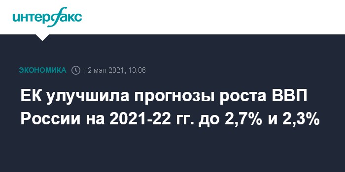 Москва. 12 мая. INTERFAX.RU - Еврокомиссия (ЕК) улучшила прогнозы роста ВВП России на 2021 и 2022 гг., предупредив, однако, что структура российской экономики и возобновившая геополитическая напряженность позволяют рассчитывать лишь на умеренное увеличение ВВП в обозримом будущем.