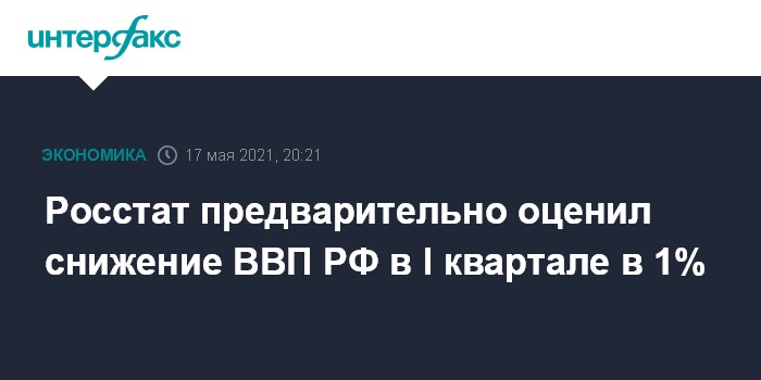 Москва. 17 мая. INTERFAX.RU - ВВП РФ в I квартале 2021 года снизился на 1,0% по сравнению с I кварталом 2020 года. Такую предварительную оценку опубликовал в понедельник Росстат.