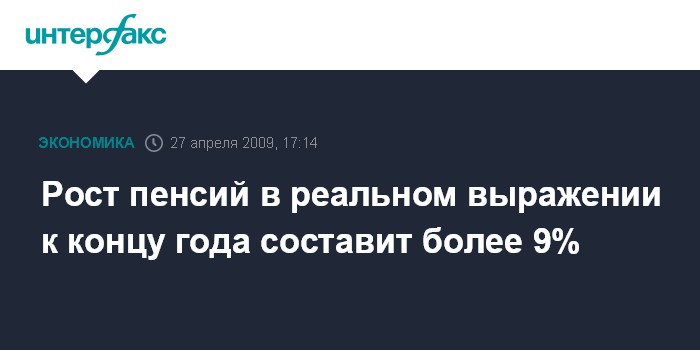 Москва. 27 апреля. INTERFAX.RU - Рост пенсий в реальном выражении к концу 2009 года составит более 9%, заявил премьер-министр РФ Владимир Путин на заседании правительства в понедельник. Средний размер социальной пенсии достигнет прожиточного минимума пенсионера, сказал он.