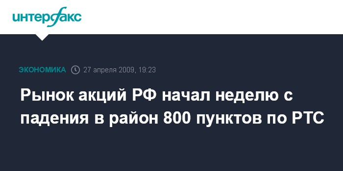 Москва. 27 апреля. INTERFAX.RU - Российский рынок акций начал неделю с падения в район 800 пунктов по индексу РТС вместе с мировыми фондовыми площадками и нефтью, что было спровоцировано эпидемией свиного гриппа в Мексике.
