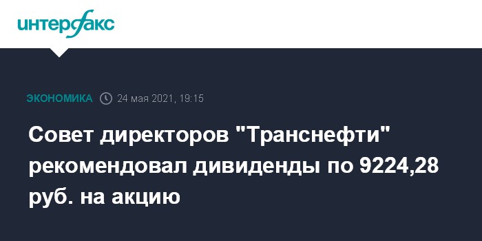 Москва. 24 мая. INTERFAX.RU - Совет директоров "Транснефти" рекомендовал направить на выплату дивидендов по 9224,28 рубля на одну привилегированную и одну обыкновенную акцию, говорится в сообщении компании.