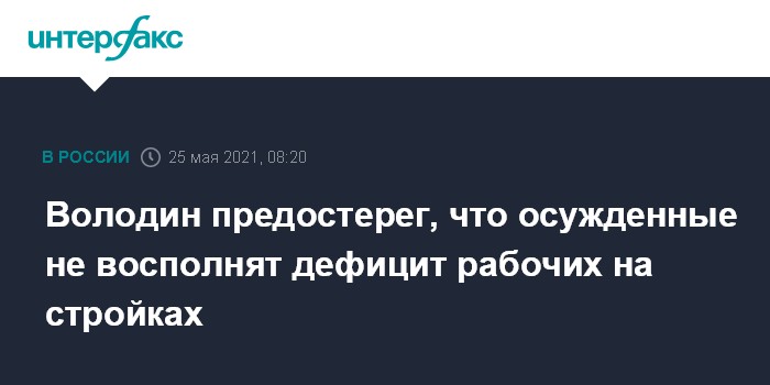 Москва. 25 мая. INTERFAX.RU - Спикер Госдумы Вячеслав Володин сказал журналистам, что в целом поддерживает идею использовать труд осужденных на крупных стройках, которым сейчас не хватает рабочих рук. Однако он предупредил, что осужденных не хватит для полной замены трудовых мигрантов.