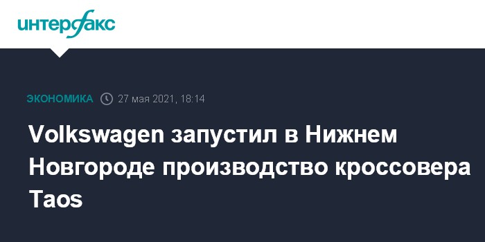 Москва. 27 мая. INTERFAX.RU - Компания Volkswagen Group Rus (ООО "Фольксваген Груп Рус", российское подразделение германского автомобилестроительного концерна Volkswagen) начала производство нового для российского рынка кроссовера Volkswagen Taos на заводе группы "ГАЗ" в Нижнем Новгороде. Об этом сообщается в пресс-релизе Volkswagen.