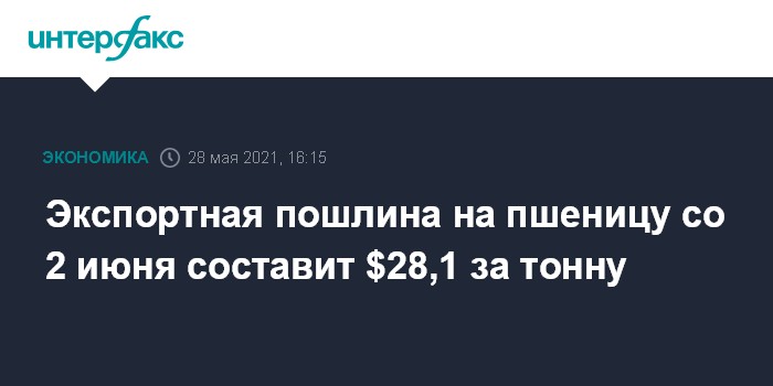 Экспортная пошлина на пшеницу со 2 июня составит $28,1 за тонну