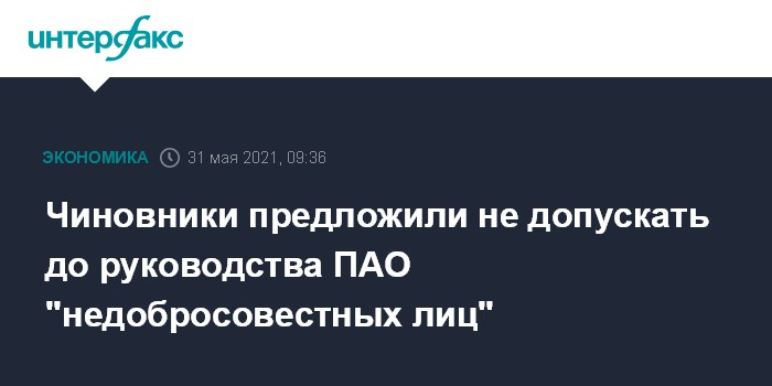 Москва. 31 мая. INTERFAX.RU - Минэкономразвития предлагает не допускать в члены советов директоров, правлений, на посты директоров публичных обществ (ПАО) "недобросовестных лиц", к которым планируется отнести привлеченных к субсидиарной ответственности либо выплачивающих убытки в пользу какой-либо компании по решению суда, если прошло менее трех лет с момента его вступления в силу.