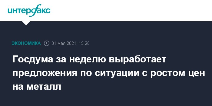 Москва. 31 мая. INTERFAX.RU -Госдума в течение недели подготовит предложения по регулированию ситуации с ростом цен на металл, они могут быть разные, сообщил спикер Госдумы Вячеслав Володин в своем телеграм-канале.