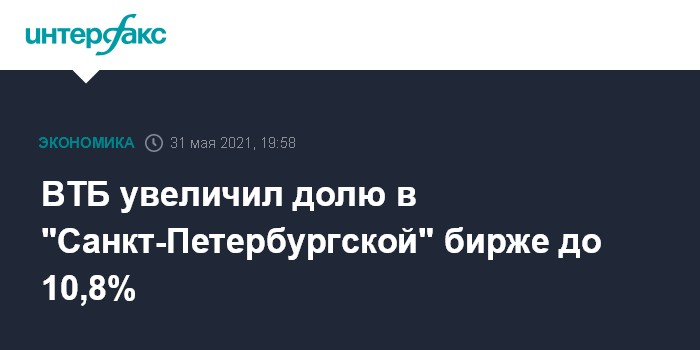 Москва. 31 мая. INTERFAX.RU - ВТБ увеличил долю в ПАО "Санкт-Петербургская биржа" с 5% до 10,8%, свидетельствуют материалы банка. Сделка датирована 28 мая, продавец акций не указан.