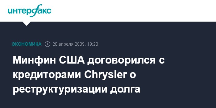 Вашингтон. 28 апреля. INTERFAX.RU - Минфин США договорился с кредиторами Chrysler LLC о реструктуризации долга автопроизводителя, сообщает агентство Bloomberg со ссылкой на источник, знакомый с ситуацией. Это может помочь компании избежать банкротства.