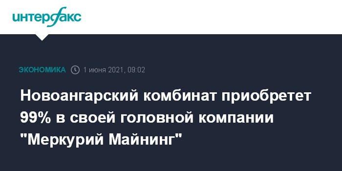 Новоангарский комбинат приобретет 99% в своей головной компании "Меркурий Майнинг"
