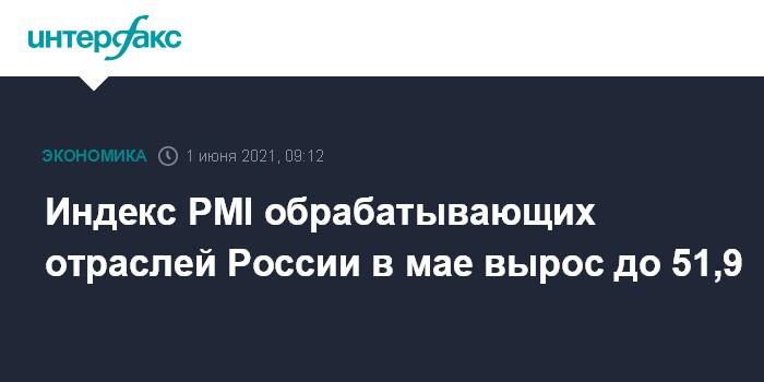 Москва. 1 июня. INTERFAX.RU - В мае 2021 года индекс PMI обрабатывающих отраслей России поднялся до 51,9 пункта с 50,4 пункта в апреле, согласно исследованию IHS Markit.
