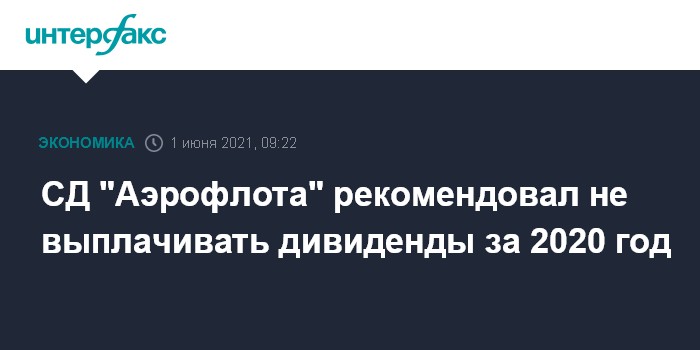 Москва. 1 июня. INTERFAX.RU - Совет директоров "Аэрофлота" на заседании 31 мая рекомендовал годовому собранию акционеров принять решение о невыплате дивидендов за 2020 год, следует из сообщения компании.