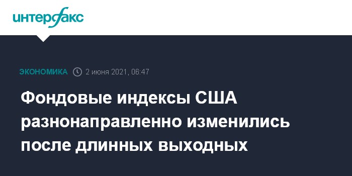 Москва. 2 июня. INTERFAX.RU - Американские фондовые индексы продемонстрировали слабые и разнонаправленные изменения во вторник после праздничных выходных в США по случаю Дня памяти.