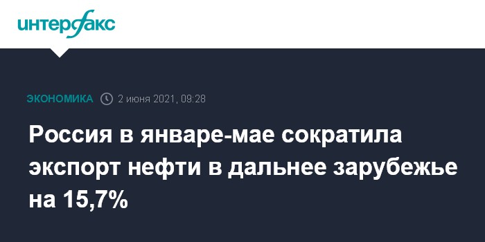 Москва. 2 июня. INTERFAX.RU - В январе-мае 2021 года экспорт российской нефти в страны дальнего зарубежья снизился в годовом исчислении на 15,7%, до 85,36 млн тонн, говорится в оперативной сводке ЦДУ ТЭК. Среднесуточный экспорт составил 4,14 млн баррелей. Поправка на високосный год учтена. Поставки нефти на российские НПЗ снизились на 2,1%.