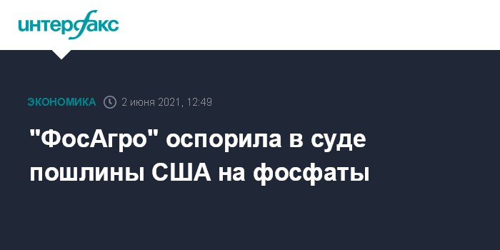 Москва. 2 июня. INTERFAX.RU - "ФосАгро" оспорила в америкнском суде решение комиссии по международной торговле США (ITC) о введении пошлин на импорт фосфорных удобрений компании, заявил "Интерфаксу" гендиректор "ФосАгро" Андрей Гурьев. Он уточнил, что апелляция была подана 7 мая.