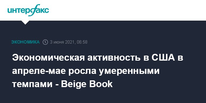 Москва. 3 июня. INTERFAX.RU - Экономическая активность в США с начала апреля по конец мая росла умеренными (moderate) темпами, несколько более высокими, чем ранее в этом году, сообщается в опубликованном в среду Федеральной резервной системой региональном обзоре, который по цвету обложки называют Beige Book ("Бежевая книга").